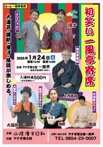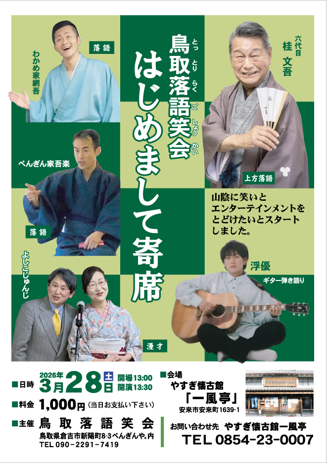 鳥取落語笑会はじめまして寄席 投稿日 2026年1月11日 著者 管理者 カテゴリー 山陰(鳥取・島根)の公演情報 催日時 令和8年3月28日(日) 会場 13:00 開演 13:30 開催場所 やすぎ懐古館 一風亭 主催 鳥取落語笑会 主催者TEL 090-2291-74719 公演名称 鳥取落語笑会はじめまして寄席 出演者 桂文吾 わかめ家網吾 ぺんぎに家吾楽 浮優 よしこじゅんじ 入場料 1000円(当日開場払い) ツイート